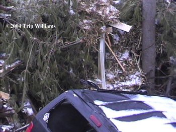 I tried to be calm, knowing that this mess needed my TOTAL attention... I got bundled up, and got in my Nissan Pickup, yanked back on the 4WD shifter and felt the bar chains on the tires bite in... Still it was a Slippery HORRID drive to the crash site. The sleet was coming down so hard I could barely see.