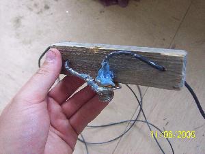 I use a strain relieve at my feed point. Just a small chunk of wood with holes drilled through it. The connector screws to the wood and the elements pass through it. Then there’s no worry of ripping the connector apart if trees start swaying. Notice below how the wire passes through the wood. By drilling the holes at an inward angle, all tension is released from the connector.
