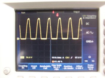 This is what the waveform will look like with no battery attached. It’s a nice pulsed DC waveform. When a 12v battery is attached to the charger this spikes will go down to around 13-14 volts. This is a current limited charge, not a voltage limited charge. This means that the voltage will drop down to half a volt or so above battery terminal voltage. As stated above, the advantage to using a current limited charge is that you can charge about any voltage battery.
