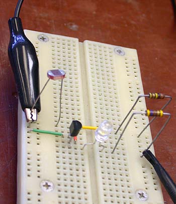 ![]() I put the LED & Photoresistor on leads so I could position them where needed. They could have also been mounted in a project box. |
