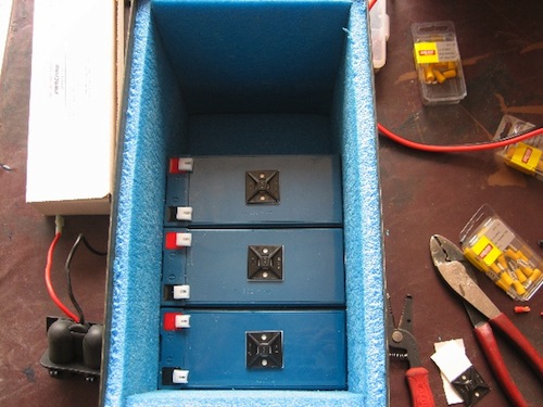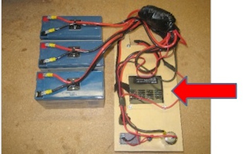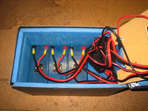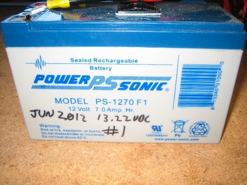 I used 7 amp hour sealed lead acid batteries (6" L x 2 1/2" W x 3 3/4" H). These are used in security systems, emergency lighting, etc. I decided to use this size because they are very common and if one of them goes bad, I can disconnect it and continue using the battery pack. If I used one large battery and it went bad, then the entire unit would be unusable.