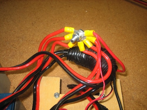 I used 10 gauge wire and connected all the wires together with nuts and bolts. To prevent shorting, I wrapped them in electrical tape, then used split loom, then more electrical tape.