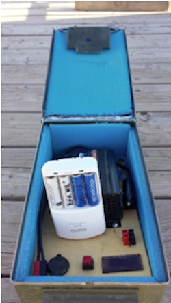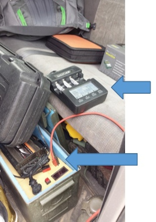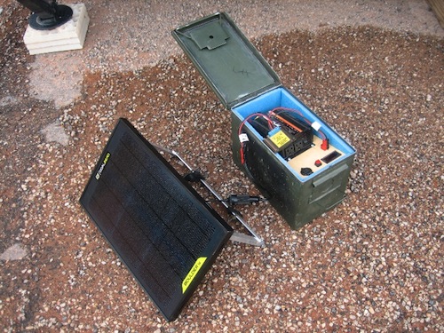 Not a great picture, but this was taken on recent deer hunting trip. I was charging AAA batteries from my headlamp from the ammo can battery box. The ammo can battery box was being charged from the solar panel on the roof of the camper shell. Throughout the trip, I also charged laptop computer with the inverter in the ammo can battery box. I was able to transfer data from the GPS to the laptop and look at a larger map on the laptop. It is really nice to be able to charge items without firing up the generator.
