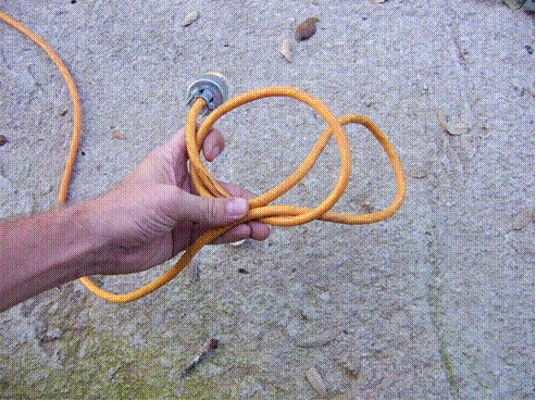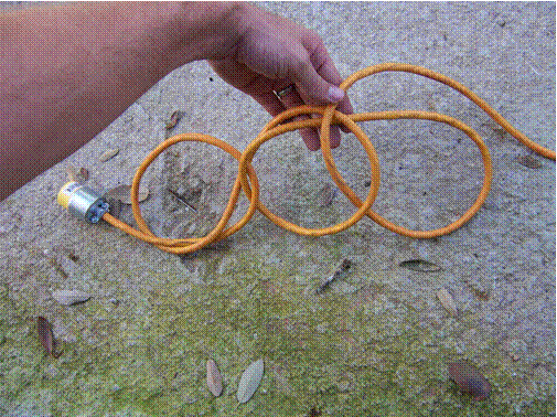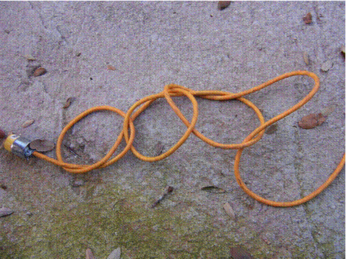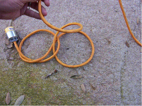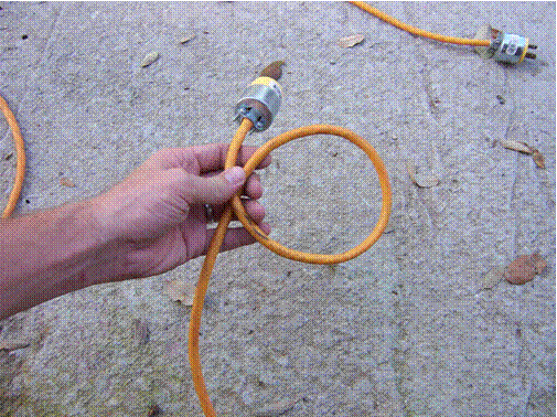 Here's a little tip to help prevent extension cords from becoming a tangled mess. Even winding the cord into a coil can still result in a knot if you're not careful. This coiling method will prevent those knots and keep the cord neat. Begin at the female end of the cord. First cross the cord as shown in the picture and begin to make an overhead knot.