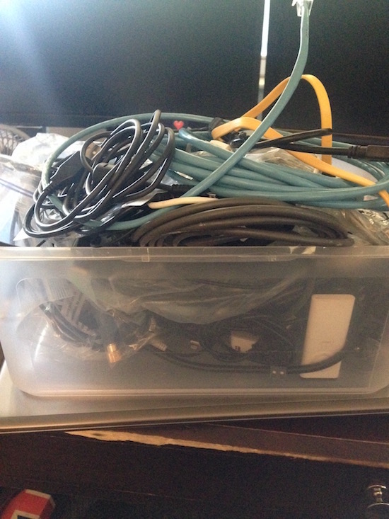 Over the years from buying and using computers, printers, modems/routers/switches, tablets, televisions, etc… I’ve amassed a collection of cables that overflowed into boxes and bins. I’m sure some of you are laughing and nodding right because you do too. It can be frustrating when you need a cable and you make a bigger mess trying to find one. Over the years I’ve attempted to par it down, but like weeds, they keep coming back.