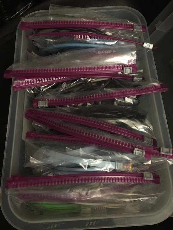 By happenstance, the short side of the storage bin was roughly the same dimension as a quart size ziplock type bag. I ran off to the dollar store and purchased several boxes of quart size bags. Like before, I organized all the cables by type. Each cable type got their own bag. I stood the bags up like file folders in a cabinet. Now I can quickly find any type of cable I need and keep everything else organized.