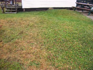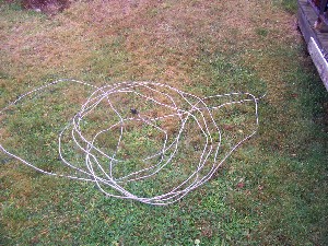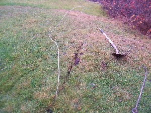 I had some 2 gauge aluminum entrance wire lying around so I stripped about 60' of it. I then used a shovel and trenched the lawn and using a rod pushed the wire in to the trench and then stomped it back closed. By next summer it will have disappeared. This piece of ground is usually wet so that'll help with grounding on the lawn.