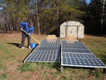 Ask your Significant Other to save the old Sponge Mop for you the next time they buy a new one.. it makes it MUCH easier to reach across Wide Solar Panel Arrays on the Ground, and to reach down long panels when working on a roof. A Sponge Mop for these tasks allows you to safely scrub off even the worst grime build-up in literally just a few minutes total time, WITHOUT scratching the Glass/Lexan/Polycarbonate/Whatever Covering!