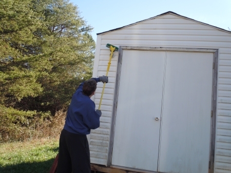 I realized the Panels hadn't been washed since they were at the old house... I have "Washing Glass Outside" down to a science... I have an old Sponge Mop (the kind with a handle used to wring it out without bending over or touching the water) and a bucket that I use specifically for cleaning Glass outside... I pour JUST A LITTLE Windex Glass Cleaner into a bucket of warm water, and then I scrub everything down...