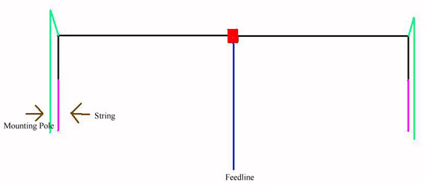 The diagram is how I have mine set up. Due to lack of space, I had to dip each end of the antenna. The dipped parts are approximately 6'. The mounting poles are metal and the dipped portions are within 12" of the metal poles. The horizontal portion of the antenna is 20' above sea level.