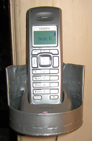 The charger for the extra handset, does NOT have a wall mount adaptor, so I made one. I cut down one of those cardboard cylinder roasted peanut cans, & covered it with duct tape.