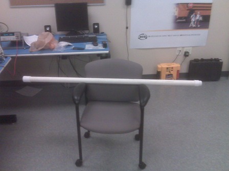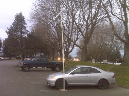 At work a while back, I came across a need to put a 2.4ghz Yagi about 15 ft in the air for cheap. Normally this wouldn't be much of a design problem, except that it needed to be in the middle of a parking lot with no way to secure the mast or guy wires. After a while wandering around Home Depot and surfing the web, I came up with a mast that can be broken down fairly compact, could support a few lbs (I really wouldn't push that... The antenna I was using weighed about 1.5 lbs, and though it never caused me any trouble, it sure did sway a lot in the wind), and required no guy wires or digging.