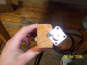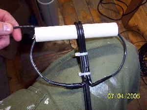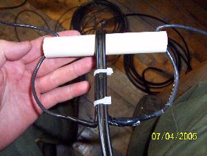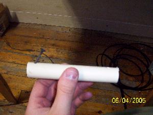 To support the center of the antenna I used a short piece of ¾" plastic PVC pipe that was lying around. Note the screw sticking out of it. I drilled a hole just big enough to fit a piece of 12 gauge through. The hole is angled so that the wires pull in to the angle which means more resistance which means less chance of the wires pulling through and winding up with a broken antenna.
