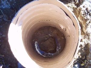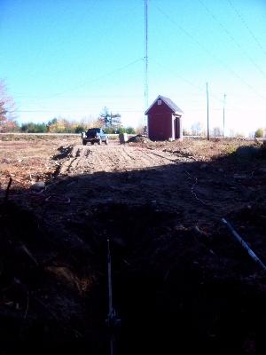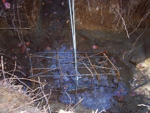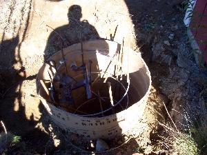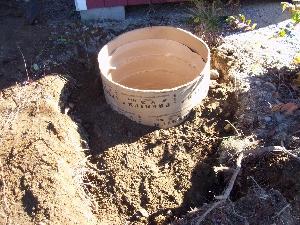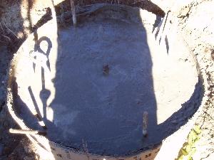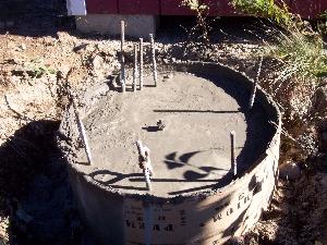 A hole was dug five feet deep with a backhoe and ledge was found. Ledge is good as it doesn't move. The tower won't sink. Due to heavy rains the hole filled up with water and had to be pumped out before I could put the sono-tube in for the cement. The tube is 30 inches diameter and 4 feet tall.
