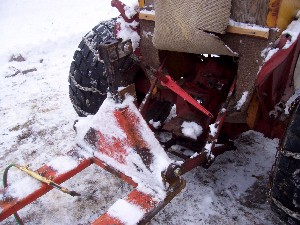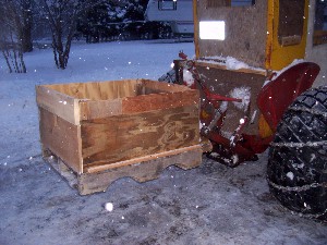 Dad made a box on a pallet to hold the sand. There's a cover to keep rain and snow out. The 3 point picks it up when full w/o a problem. So I can lower it to the ground to fill it and then pick it up to use as ballast.