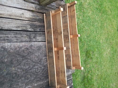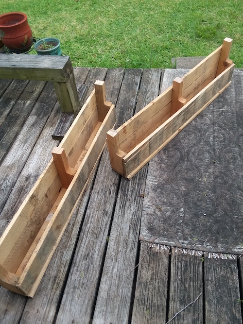 The front is 6" high, the back is 9" high, and it is 5" wide. I still have a little sanding to do, and some wood glue to insure everything is solid. She wants it to look rough which it is. My grandsons bed frame is made from reclaimed 5" diameter Cedar fence post and old barn slats for the head board.