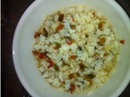 First thing I started hydrating the peppers and potatoes. Last time, I waited too long and didn't give them enough time. This time I poured the near boiling water to cover and hydrated them over 20 minutes. Much better. I also dehydrated some pepper by themselves in order to use in an omelet.