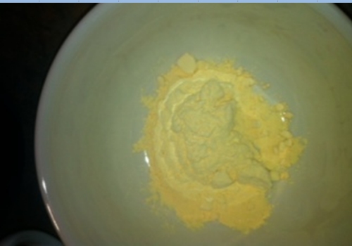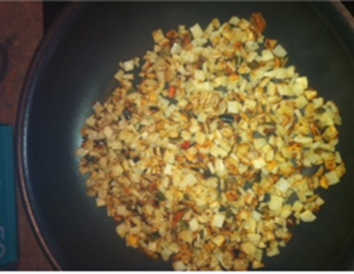 While they were hydrating, I started the eggs. I took 4 Tbl of mix in order to create a 2 egg omelet and added 7 Tbl water. I went with a 1 part mix with 2 parts water to simulate the egg mixture, plus 1 Tbl of extra water as that is what I add to fresh eggs when making a 2 egg omelet. The mixture seemed slightly more liquid than a fresh egg mixture. Next time I will go with a straight 2 to 1 ratio.
