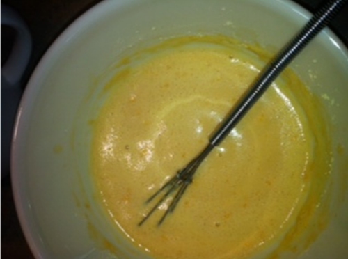 This is the egg mixture right after pouring it into the pan. You can see the edges start to bubble just like fresh eggs. This mixture worked much better than my first experiment.
