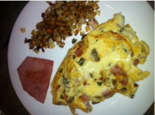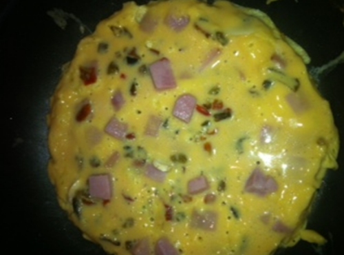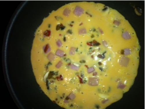After mixing the eggs up, I let them sit while getting the peppers, ham and mushrooms ready. I put the omelet ingredients on the pan to give them a quick sauté before pouring in the egg mixture.