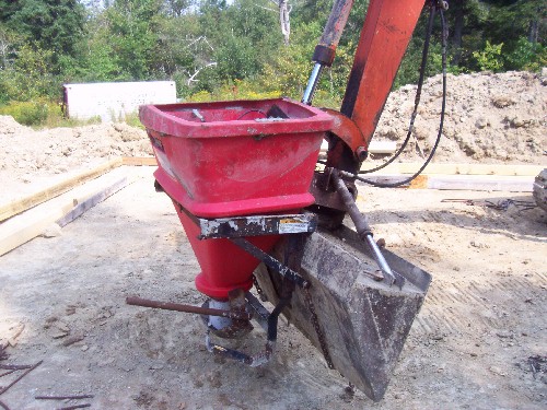 I can't lay claim to this one, but the guy who can is quite smart. This is a cement bucket that attaches to his backhoe, it holds 1/3 yard of cement and eliminates pumping and shoveling. We used it to pour a footing and I'm impressed. It used to be a salt/sand spreader and was slightly modified.