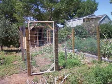 At a clearance sale, we had purchased a large amount of wire fencing. It is 4 feet high with 2x4 inch openings. It isn't traditional chicken wire, but it is paid for. Two days with a post hole digger got the yard laid out. Using the wire fencing to create a 1 foot "no dig" skirt and climb proof top two runs of fencing wrapped up the yard. For ease of access, two gates are installed to make it easier to take care of the birds and have wheelbarrow access for clean up.