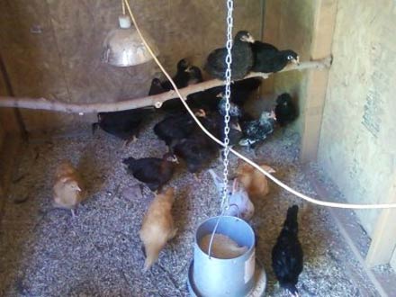 Inside the coop, we decided to go with a nest box design we saw on YouTube. Using 1x2 inch lumber to build a framework to support plastic tubs, we made easy to clean nest boxes. The tubs are easy to remove and clean. A 2x4 with a lag hook suspends the feeder off the ground. The water tank rests on some paver blocks to keep it from filling up with stuff on the floor. Chicken feet, like all bird feet, are happier on round roosts. Think tree branches. So, being thrifty again, Mulberry branches left over from spring tree trimming were installed as roosts to keep the birds happy.