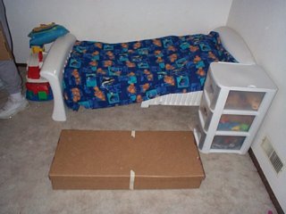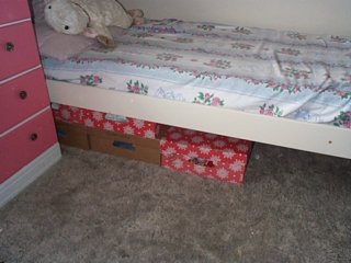 This is under the Sons bed and you can see we put the box together inside out however they don’t fold so well. And since they will be covered with bedding anyways we decided just to fold them with the Christmas decorations on the outside.
