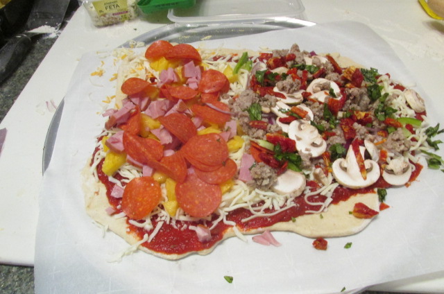 Had about 15 toppings anyone could make any pizza they wanted at the "Pizza Station". Pepperoni, I blended n seasoned several sausages for a killer chunky crumble sausage, hamburger Canadian bacon, pineapple, fresh basil, black olives, 3 colors of bell peppers, sun-dried tomatoes, sliced mushrooms, purple onion, Mozzarella and 3 cheese blend, feta cheeses, anchovies, pulled string cheese apart for a "Stuffed crust" etc..