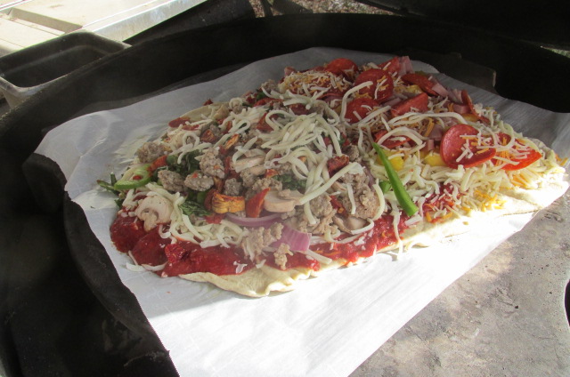 Pro-Tip I put the pizza-parchment combo on the stone and cook for about 3-4 min. It gives the dough time to cook without sticking to the stone. I pull the pizza out, n put it on a pizza pan, yank the parchment out to finish cooking the pan-pizza on the stone without burning the crust. I try to keep the temp at 425-450F max.