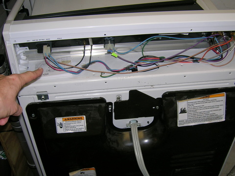 Looks complicated? Really not that bad. Even tells you what the components are (motor, thermal fuse, timer, relay, etc), and the wire color. On a dryer, I like to check the thermal fuses first if it's not working at all. Okay, no such components in the section we've opened. Onto the main back panel.