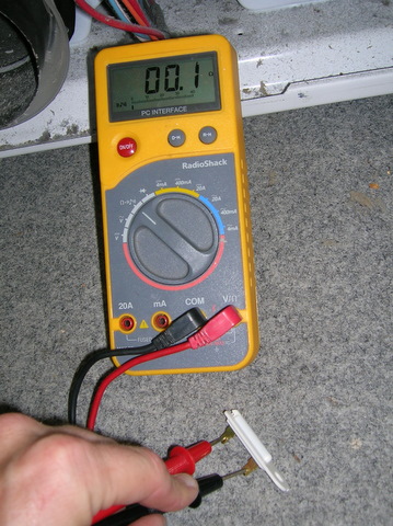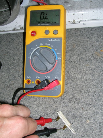 One screw to remove (didn't have to), but I do recommend removing the wires. Some circuits can cause false readings on components unless the wires are disconnected. It should be shorted (zero Ohms). Mine measures open (infinite Ohms). Dead. But this is good, found the failed component. I did temporarily bypass the fuse, plugged the dryer in, and verified normal operation.