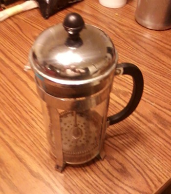 The French Press is the next up in terms of sophistication. The proportion of coffee to water is about the same a tablespoon for a large cup. It is much like the former method, except the water is boiled separately and the grounds are placed in a cylindrical carafe with a lid featuring a screened plunger. The water, when it boils, is poured into the carafe and the brew is stirred. The lid with the plunger is then fitted in place and the coffee is left to steep. After four minutes, the plunger is pressed, pushing the grounds to the bottom and stopping the brewing process. It is mechanically more complicated than the boiling method above, but functionally simpler because it doesn't take as much care you merely have to follow instructions. The coffee is strong but smooth it's impossible to get that "burnt" taste from coffee that's been left heated too long, though over-steeping will make it bitter.