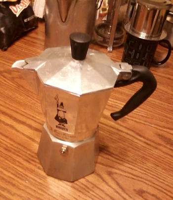 The Italians are credited with inventing espresso; along with food, wine, high-performance motorcycles and fascism, coffee of all kinds is something the Italians do very well. The Moka Pot was invented by the Italian firm Bialetti in the 1930s and remains essentially unchanged. It doesn't quite make espresso but something very close. It uses the same fine grind and works on an interesting principle similar to percolation but different, in that the water is only run through once. The Moka Pot has two vessels. The lower one holds water and a sort of funnel with a filtered basket for the espresso-ground coffee. The upper pot has a second filter at the bottom (to keep the grounds where they belong) and a fountain spout running up its center.