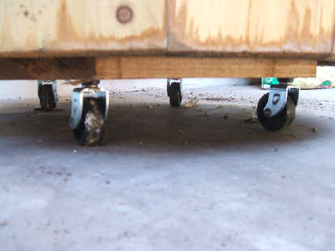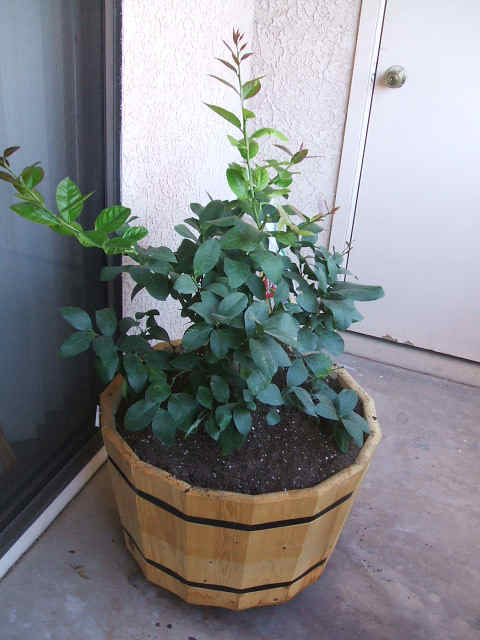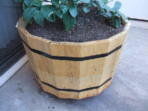 I chose a wooden half-barrel container, predrilled with several holes in the bottom. The dimensions were 24" diameter x 15" tall. The folks at the nursery assured me this was as large a container as the tree would ever need. I also picked up a 17" octagonal wheeled container transport, which I placed under the container before filling the container with dirt.