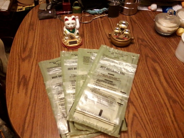 The things are meant to be used to heat either "entrees" in their heavy-foil retort pouches (similar to those which small servings of tuna and other foods now come in - and guess where they got THAT idea), or beverages like coffee, tea and cocoa in the "Hot Beverage Bag." Being a Soldier "of a certain age," I've seldom bothered using the heater-uppers - I started off eating the things unheated, and that's how I tend to continue eating them. So I've accumulated a rather large quantity of these heater-uppers and bags.