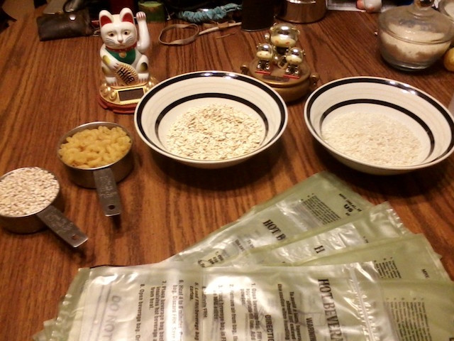 These things are simple enough and sufficiently hearty that one can keep body and soul together with them. They also form the basis for simple meals, with the addition of meats, sauces and such "doctoring up" as the adventurous field-chef can devise. I will go through what I did for each foodstuff and report the results, whether good, bad or indifferent.