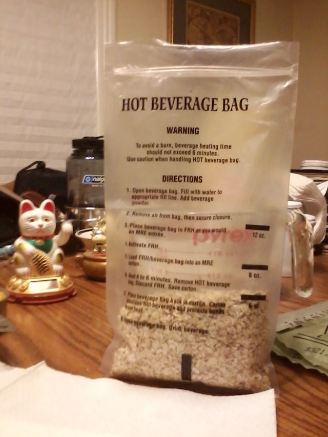 Much research and thought goes into making them palatable and a complete meal. For many years now each meal includes a "Flameless Ration Heater" and a "Hot Beverage Bag." The Flameless Ration Heater is a sort of plastic envelope which holds a porous envelope inside it. This latter contains a chemical compound that gets hot when it comes in contact with water. The idea is that the Soldier decides which part of the meal he wants heated up - MREs come with only one heater-upper per meal, though the Soldier can save them and there are always plenty left unused in the "share box" (the time-honored tradition of an opened MRE carton into which each Soldier puts those things he doesn't like, from which everyone can pick over and snack on at will and leisure) - puts the item in the heater-upper envelope, pours a tiny bit of water in, closes it up according to the instructions printed on the heater-upper, then waits. Ten minutes or so later, the thing is quite hot and ready to be eaten.