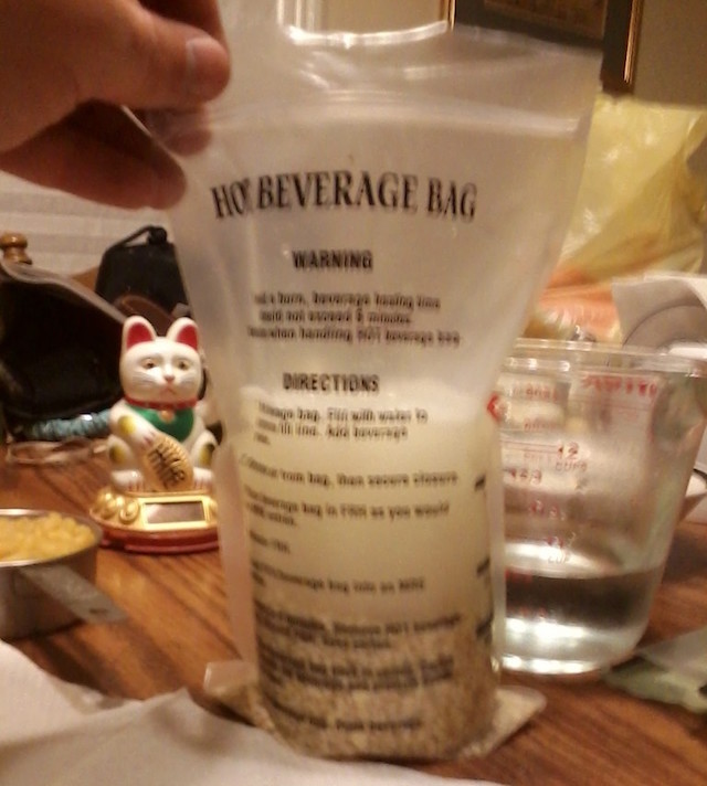 But let's not throw out the baby with the MRE water. The method will cook quick oats, provided I get the proportions down. Likewise liquid stuffs such as canned soup - split a can of Campbell's broth-based soup between two heater-uppers, fill the remainder with water and use normally. Powdered soups likewise can be similarly done up without fear - Maggi puts out several good ones, especially those found in "import" grocery stores catering to European expatriates (there are dozens of such stores in Chicago and plenty of online vendors). They are of such size as will work well with the Hot Beverage Bag. Instant rice will work well when added to soups before heating, as would the little pouches of pre-cooked bacon bits.