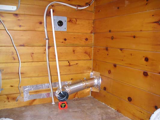 The completed bend is now connected to the outside vent pipe with a very short piece of flexible pipe. Band clamps keep everything in place and metal tape securely seals the connection against air leakage.