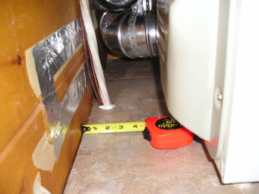 This last picture shows the dryer in position and ready for the first load. As shown the dryer is only a few inches from the wall and there is little chance of crushing the vent pipe.
