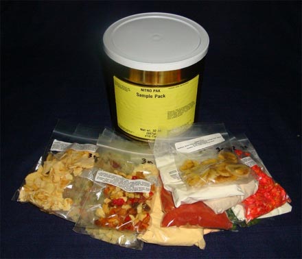 Nitro Pak had exactly what I wanted. On their web site, I found that they offered a #10 can called "Sample Food Pak". For $19.95, this can contained various types of food such as veggies, potatoes, a meat, dairy and fruits.