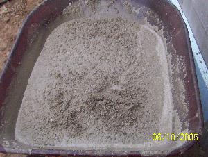Ok here’s how it’s done. Have a dry shovel dedicated for the Quikrete bag only. Don’t allow it to get wet. Shovel 10 shovels full of clean gravel (grittier the better) into the wheel barrow. Clean means that you don’t want clay clumps or other clumpy material in it. Then add 2 shovels full of Quikrete. This will give you a good mix, I tend to throw in an extra ½ shovel full just cuz. It makes it even STRONGER! DON’T ADD WATER YET!!