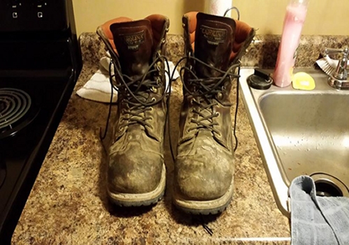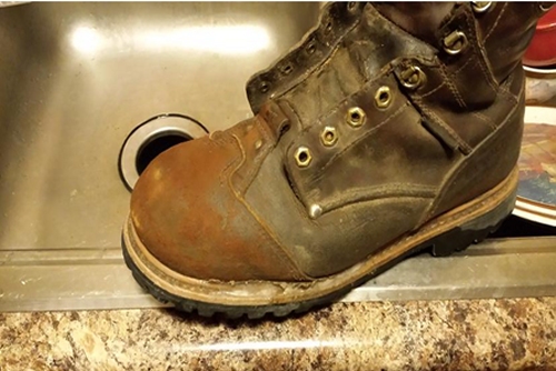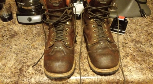 You can see the waxy looking coating on the boots, which means they have soaked up as much as they can. I'll also add that I use Obenauf's boot laces also, which don't loosen up and won't come untied. I highly recommend them. The conditioner also works wonders on gloves that have gotten wet and stiff. Something so simple, that makes such a difference, should not be over looked in your preps.