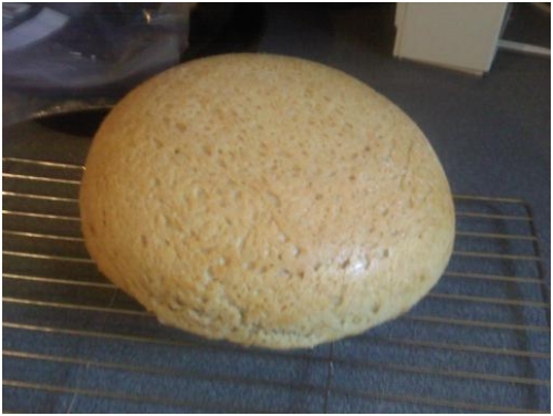 I let mine go the full 24 hours and it had a very nice sour smell too it. At the end of the wait, 8-24 hours, pour out into a greased glass or ceramic bowl that is oven proof. Cover and let sit 1 more hour, then pop into a 375* preheated oven for a minimum of 45 minutes or until golden brown. The first loaf, pictured below, was in for 55 minutes before I removed it. I left it cool, almost completely, but couldn't wait so cut it still slightly warm and slathered on the butter (yes, I eat real butter because I am a real man...plus I don't like what margarine does to your system). Hmmmmm, it was good. Moister than most no knead breads, but still heavier than regular homemade white bread, crust was nice and chewy, just really good.
