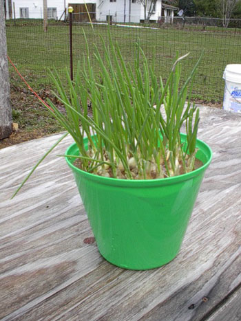 How would you like to have fresh green onions year round at you finger tips? Well you can with very little effort and a small amount of planning. Go to you local gardening, farm supply, hardware store or even Wally World in the spring any buy some onion sets. If you can find the in bulk they are usually cheaper. When purchasing choose set, that are solid and firm. The larger set will store longer and are usually a little cheaper but the small sets will give you more per pound. Find a growing container that will fit in any sunny window sill that is convient to your kitchen. Our bathroom window works well because the sill is wide, faces east and is next to the kitchen. Put about 1 inch if gravel (from our driveway) in to your container and fill to about 1 inch from the top with dirt, sand, compost, literally what ever you can dig up. Push your onion sets root end down into the “soil” shoulder to shoulder, as many as you can fit in. They should be just barely covered. Keep the soil moist but not waterlogged. In about 2 weeks you should have some small tender green onions. As you harvest, thin the onions out to give them more room as they grow. You might want to start a new batch about once a month depending on how many you use and how large your container is.
