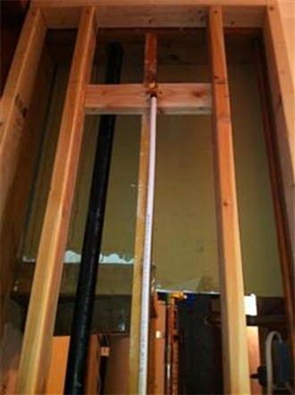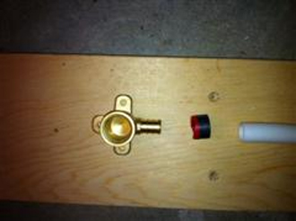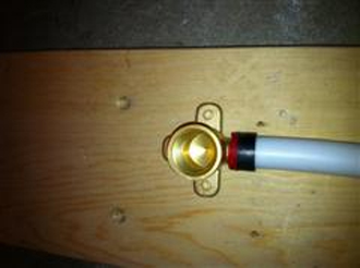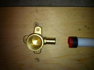 A month ago I added a washer and a sink to my house. I used PEX for this addition. Now, I wanted to connect a tub to this run. I added the faucet to my rough-in using PEX. I used galvanized pipe for the drop and PEX for the supply and the shower. As you can see, the PEX will make a pretty tight bend without needing a fitting. Caution must be taken not to crimp the line. The fitting were 1/2 inch female pipe threads to 1/2 inch PEX compression.