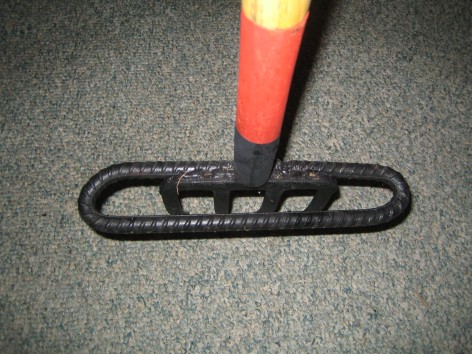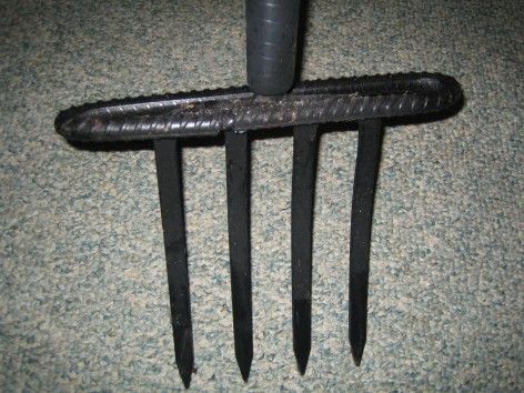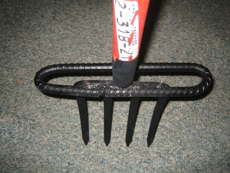 The digging fork has a standard 2 ½ inch shoulder; I corrected this by utilizing a 30 inch piece of 3/8 inch rebar. Taking the rebar and forming an elongated circle and welding it to the entire length of the fork at the shoulder, I was able to create a foot rest suitable for digging.