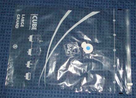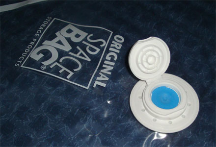 For demonstration purposes, I chose a Large Cube bag. Each bag has pictorial instructions stamped on them. There is a printed white line just below the opening, which is the "fill to" line. Overfilling can stretch and damage the bag when vacuuming the air out. The valve shown in the next picture is a simple flap valve allowing air to be sucked out while not allowing air to reenter.