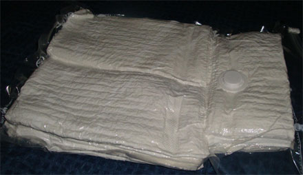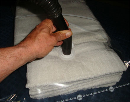 So, I just pressed the vacuum machine nozzle against the valve and that did great. The bag compressed to about half-size as the air was vacuumed out. The towels I used where pretty thick so half-size was great. But, I wasn’t really worried about space as much as I was about keeping the towels protected.
